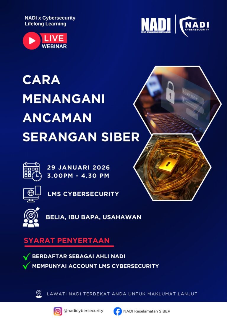 NADI X CYBERSECURITYTajuk: CARA MENANGANI ANCAMAN SERANGAN SIBERTarikh: 29 januari 2026platform: LMS CYBERSECURITYππππ ππππππ πππππ: Boleh datang ke NADI NADI Kampung MaritamUntuk info dan maklumat lanjut, boleh hubungi petugas NADI Kg Maritam: 011-62748773