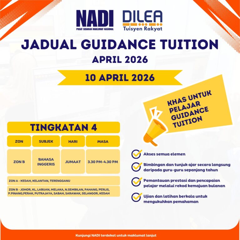 π’ GUIDANCE TUITION 10 APRIL 2026: TINGKATAN 4 π’ Untuk pelajar Guidance Tuition Tingkatan 4, teruskan momentum pembelajaran anda dengan menyertai kelas bimbingan berfokus! Sila rujuk lampiran jadual untuk sesi pada 10 April 2026: π ZON B (Johor, KL, Selangor, […]