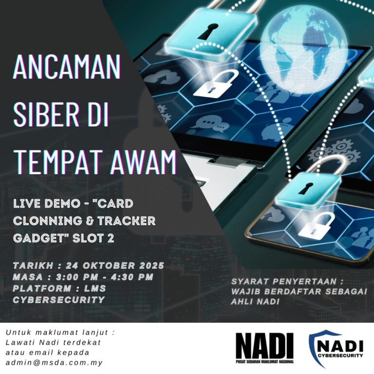 [WEBINAR NADI x CYBERSECURITY]ANCAMAN SIBER DI TEMPAT AWAM LIVE DEMO CARD CLONNING & TRACKER GADGET SLOT 2 24 OKTOBER 2025 (JUMAAT) 3:00 PM β 4:30 PM Platform: Zoom Pautan Pendaftaran: cybersecurity.nadi.my (untuk ahli NADI sahaja) Apa yang akan dipelajari? Saksikan Live ekslusif. Cara penjahat memanfaatkan kelemahan pengguna […]