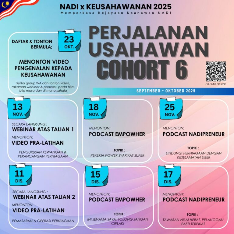 PENCARIAN IKON USAHAWAN NADI 2025 – PENGAMBILAN COHORT KE-6 Langkah 1:Borang pendaftaran seperti di pautan berikut : https://form.nadiusahawan.com/k-daftar-cohort Langkah 2:Sertai kumpulan WhatsApp rasmi Cohort 6 bagi tujuan komunikasi seterusnya. Pautan kumpulan WhatsApp rasmi Usahawan Cohort 6 : https://chat.whatsapp.com/L2drlNAeb1XG0rG3eIXKvL Langkah 3:Selepas […]