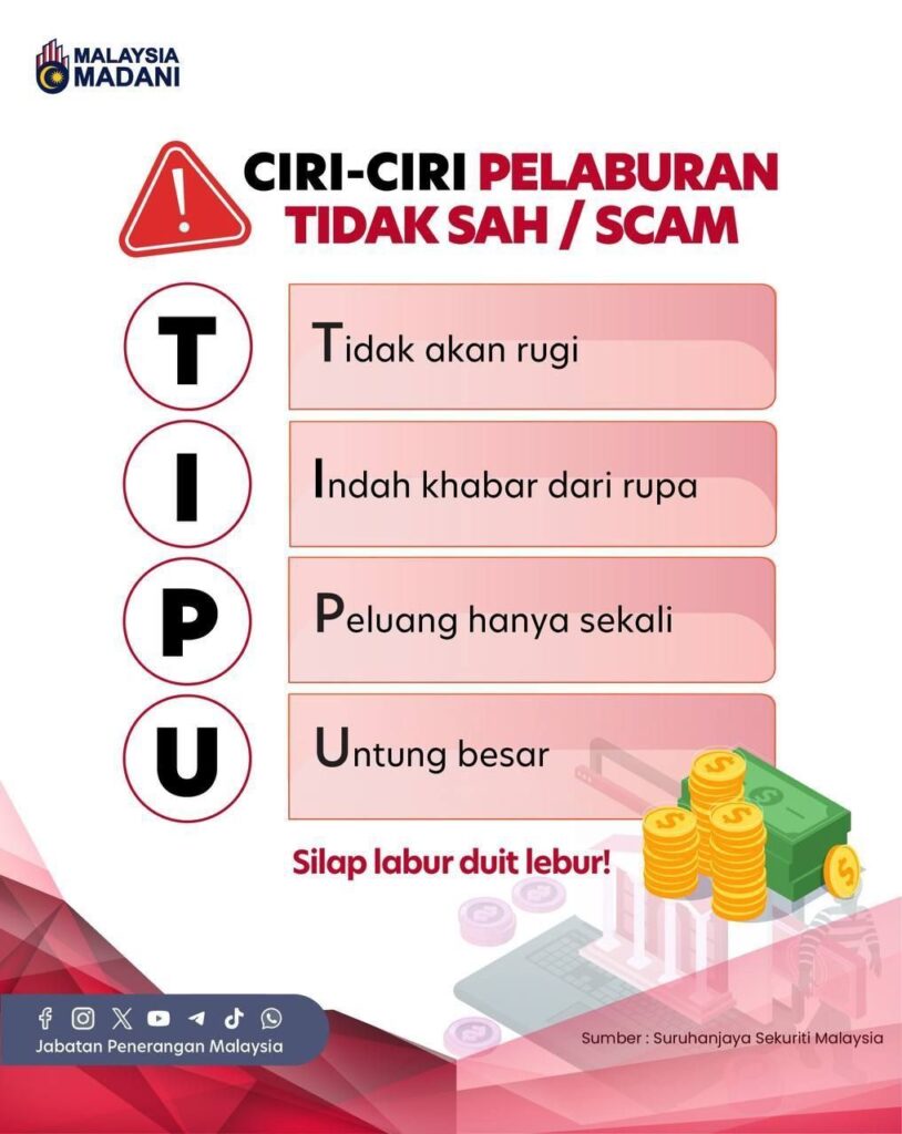 CIRI-CIRI PELABURAN TIDAK SAH/SCAM Maklumat Am | May 15, 2025 Elak Terjebak Pelaburan Scam! Jangan serah duit anda kepada skim yang meragukan! Kenali tanda-tanda pelaburan tidak sah sebelum terpedaya. Lindungi wang, jauhi penipuan! #MalaysiaMADANI#TaatSetia#JabatanPenerangan