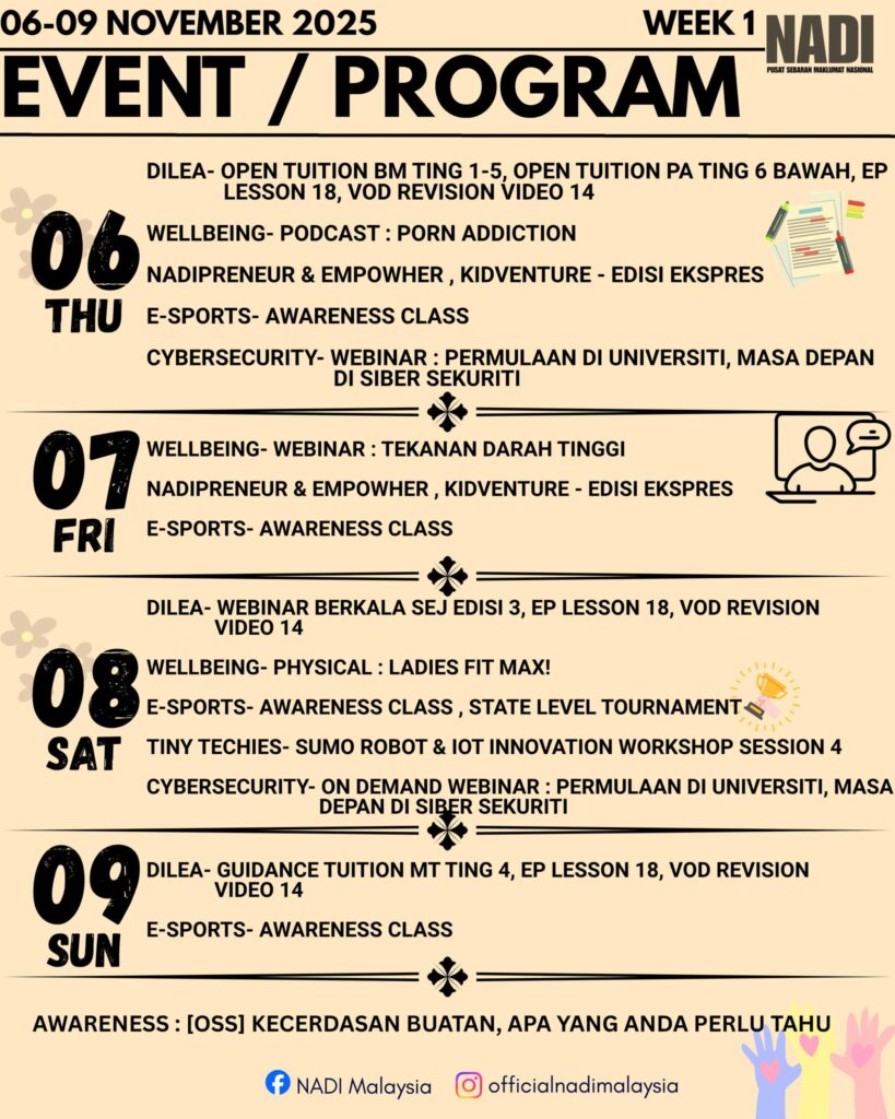 Rasai minggu penuh ilmu, aksi & inspirasi bersama NADI! Dari kelas bimbingan akademik hingga bengkel keselamatan siber, semuanya disusun khas untuk bantu komuniti terus maju.