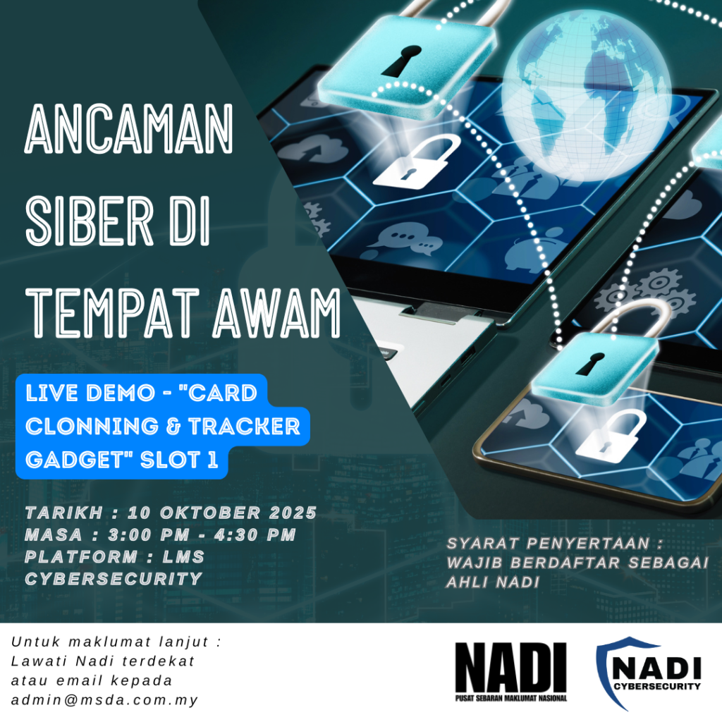 Jemputan untuk menyertai Webinar NADI x Cybersecurity bertarikh 10 Oktober 2025 yang bertajuk Ancaman Siber di Tempat Awam . Live Demo Card clonning and Tracker Gadget. Butiran lanjut adalah seperti dibawah:
