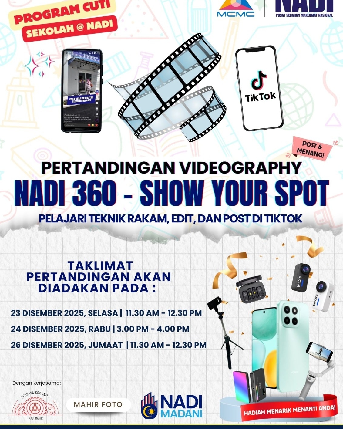 Tak tahu nak buat apa masa cuti sekolah? Jom sertai Program Cuti Sekolah @ NADI dengan pelbagai aktiviti menarik untuk semua. 22 hingga 30 Disember 2025 NADI berdekatan anda Jumpa anda disana! #NADIMCMC#CutiSekolahDiNADI#PerkhidmatanPintarNADI