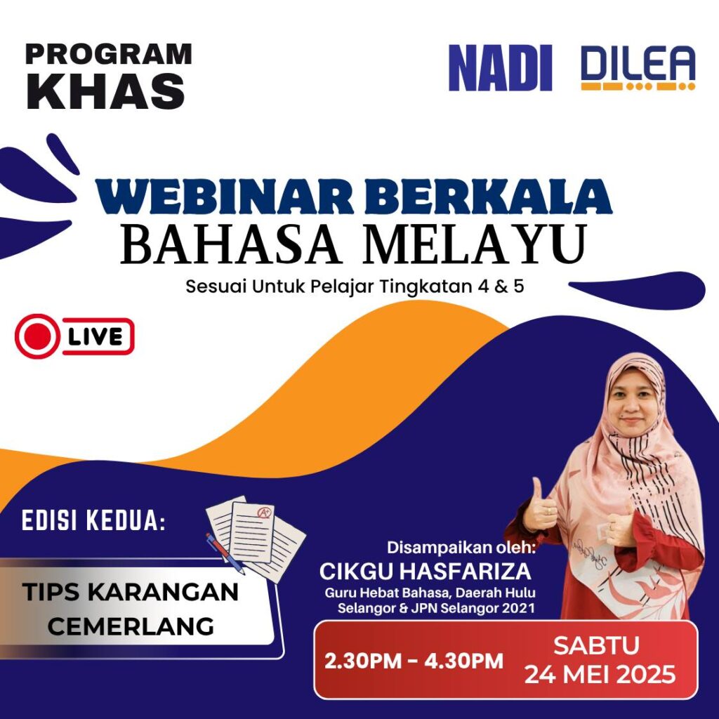 Sukacita dimaklumkan di bawah Elemen Program Khas NADI-Nurture DiLea, Webinar Berkala Bahasa Melayu Edisi Pertama akan diadakan dan terbuka kepada pelajar Tingkatan 4 dan 5.
