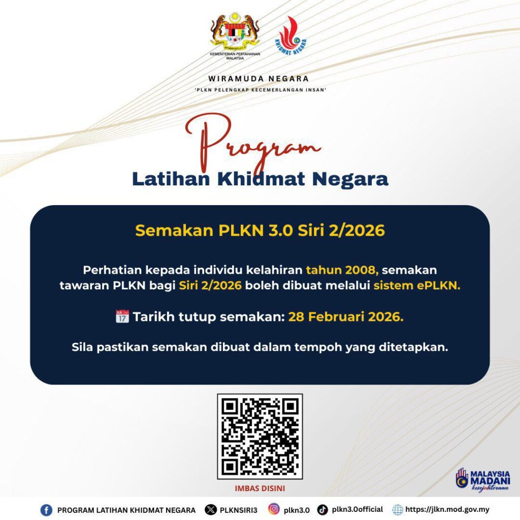 SEMAKAN PENGAMBILAN PELATIH PROGRAM LATIHAN KHIDMAT NEGARA (PLKN 3.0) SIRI 2 TAHUN 2026 DIBUKA BERMULA 20 FEBRUARI 2026