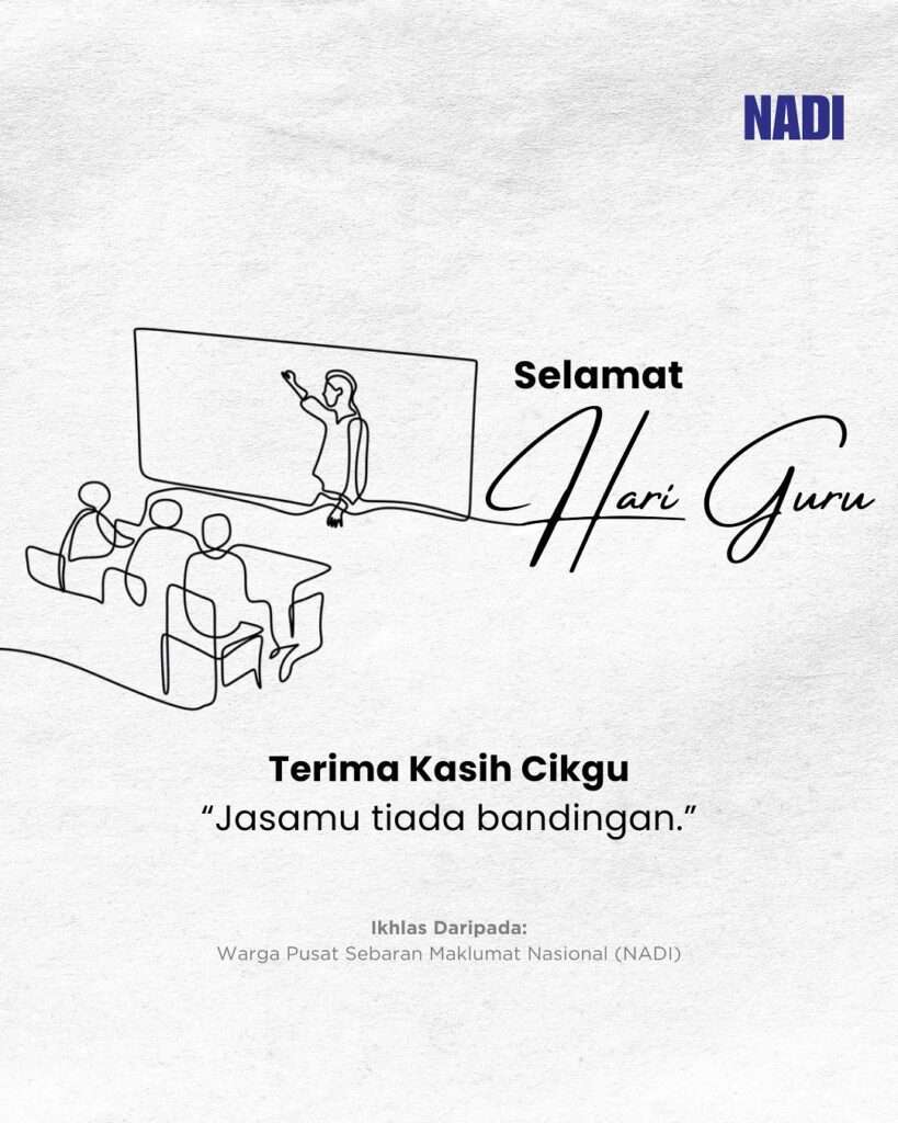 SELAMAT HARI GURU Maklumat Am | May 16, 2025 Ilmu yang dicurahkan menjadi bekal sepanjang hayat. Terima kasih kepada para pendidik atas segala usaha dan pengorbanan dalam membina masa depan bangsa. NADI